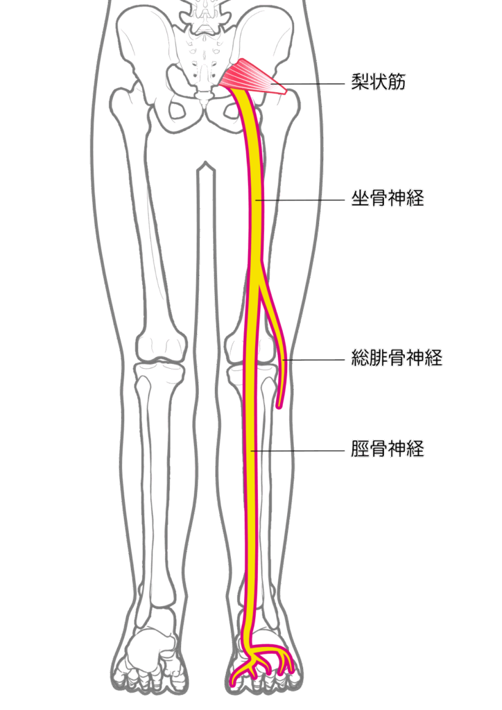 梨状筋症候群というのは腰から骨盤、お尻を通って足の先まで伸びている坐骨神経が、お尻にある梨状筋が緊張して硬くなることによって圧迫されて、お尻から足の後ろ側に痛みやしびれ、麻痺などの症状が出るいわゆる「坐骨神経痛」のことです。